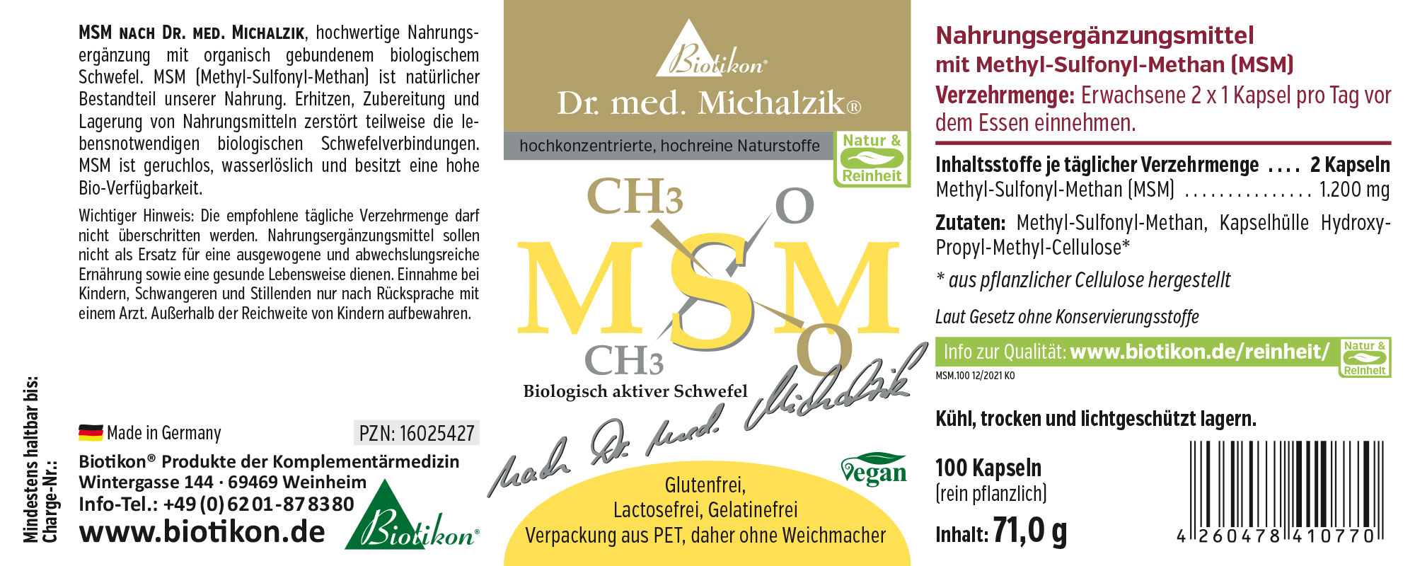 MSM di Dr. med. Michalzik è soggetto a rigorosi esami dalle autorità preposte di vigilanza tedesca. È realizzata con tecnologie di produzione delicate senza generazione di calore e senza additivi nel confezionamento della capsula così come qualsiasi coadiuvanti tecnologici, che non deve essere indicata sulla confezione.